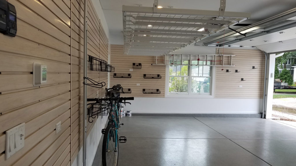 So what’s an affordable, quick, and easy storage solution to get all the stuff you need to store off the floor? Slatwall panels and slatwall accessories! Save space with garage wall storage.